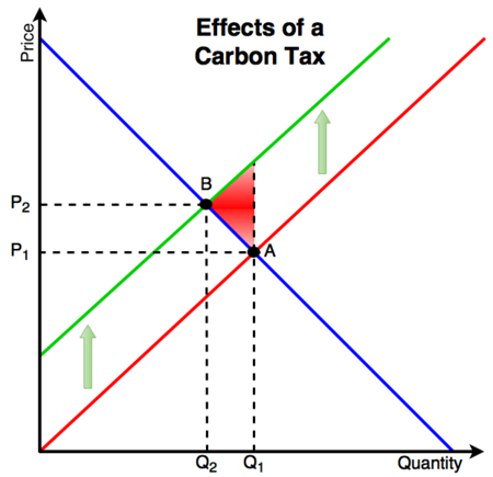 A carbon tax raises the price per unit of fossil fuel which decreases the demand for the good. In addition to modifying behaviour which has harmful effects, the carbon tax also raises revenues that can be used to promote a low or no carbon energy alternatives or to fix the damage already caused to the environment. Additionally, the revenues raised from a carbon tax would allow a government to cut other forms of taxes which can distort a market and make it less efficient.[3]