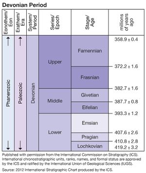 - ↑ International Commission on Stratigraphy."International Chronostratigraphic Chart v2012" Accessed Nov.16, 2018 [Online]. Available: https://www.britannica.com/science/Famennian-Stage/media/201153/133200