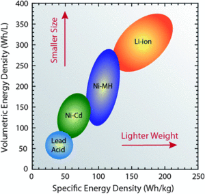 An energy storage device can be used either as the energy supply for a system or as a unit to store energy from a generator. For example, a lead-acid battery can provide electrical power for a motor vehicle while a Lithium ion battery can be used to store energy for a cell phone. Compared to fuels, energy storage has the advantage of being able to recharge its energy without the need to add more materials to its system. For a visual comparison, the energy densities of the batteries are displayed in Figure 1.