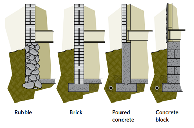 - Rubble, Brick, or Stone: These are older foundations composed of large pieces of material. These foundations are generally uneven and very in depth and thickness. These foundations are rarely water proofed and can absorb water from the soil.