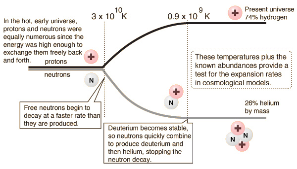 When the universe expanded it cooled off, meaning that this recombination was no longer possible, and neutrons began to decay. However, due to the stability of the deuteron (a neutron bound to a proton), this decay was thwarted, and neutrons were able to exist much longer than in their free state. The deuterons were then able to fuse into helium at a later time, explaining the abundance observed today. Figure 2 below demonstrates this process (the 74% of hydrogen and 26% of helium are their relative mass abundance, not the abundance compared to all other elements).