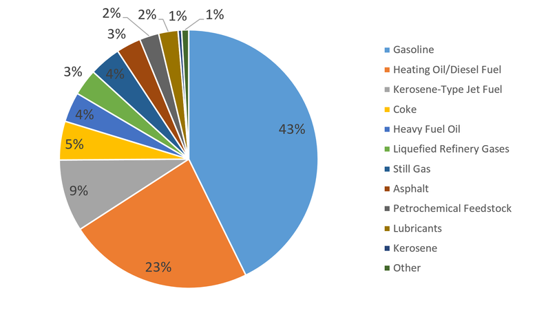 Each product obtained from the refining process is collected in different amounts. In Figure 1, the percentage of the final 170 liter volume that each product makes up is shown in a pie chart. From the image, it is apparent that vehicle fuels make up a large portion of the final product. In liters, gasoline makes up about 73 liters of the final 170, diesel and heating oil make up about 40 liters, while kerosene-type jet fuels make up about 15.5 liters. Despite the fact that these numbers are comparatively large, it does not mean that the other products are not useful. For example, petrochemical feedstocks make up only 4.2 liters of the final 170, however they are used to make a variety of different products from pharmaceuticals to plastics.[4] More information about the vast number of products that can be created with petrochemical feedstocks can be found here.
