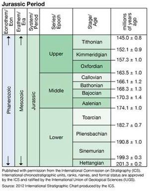 - ↑ University of California, Museum of Paleontology."The Jurassic Period" Accessed Nov.18, 2018 [Online]. Available: http://www.ucmp.berkeley.edu/mesozoic/jurassic/jurassic.php
