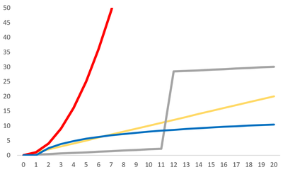 One of the biggest concerns about climate change is that some responses to increased greenhouse gases will be linear for a while, but will then have a sudden jump. These sudden jumps are often irreversible. This kind of relationship is shown with the grey line in Figure 1. Other relationships shown here are power relationships - shown in red - which is more than linear, as well as logarithmic in blue. This relationship shows a potential situation wherein more greenhouse gases being added to the atmosphere has comparatively less impact than a strictly linear relationship.