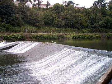 Weirs can be constructed out of several different materials, depending on their age and purpose. Wood, concrete,[3] or a mixture of rocks, gravel, and boulders can all be used to construct a weir.[4]